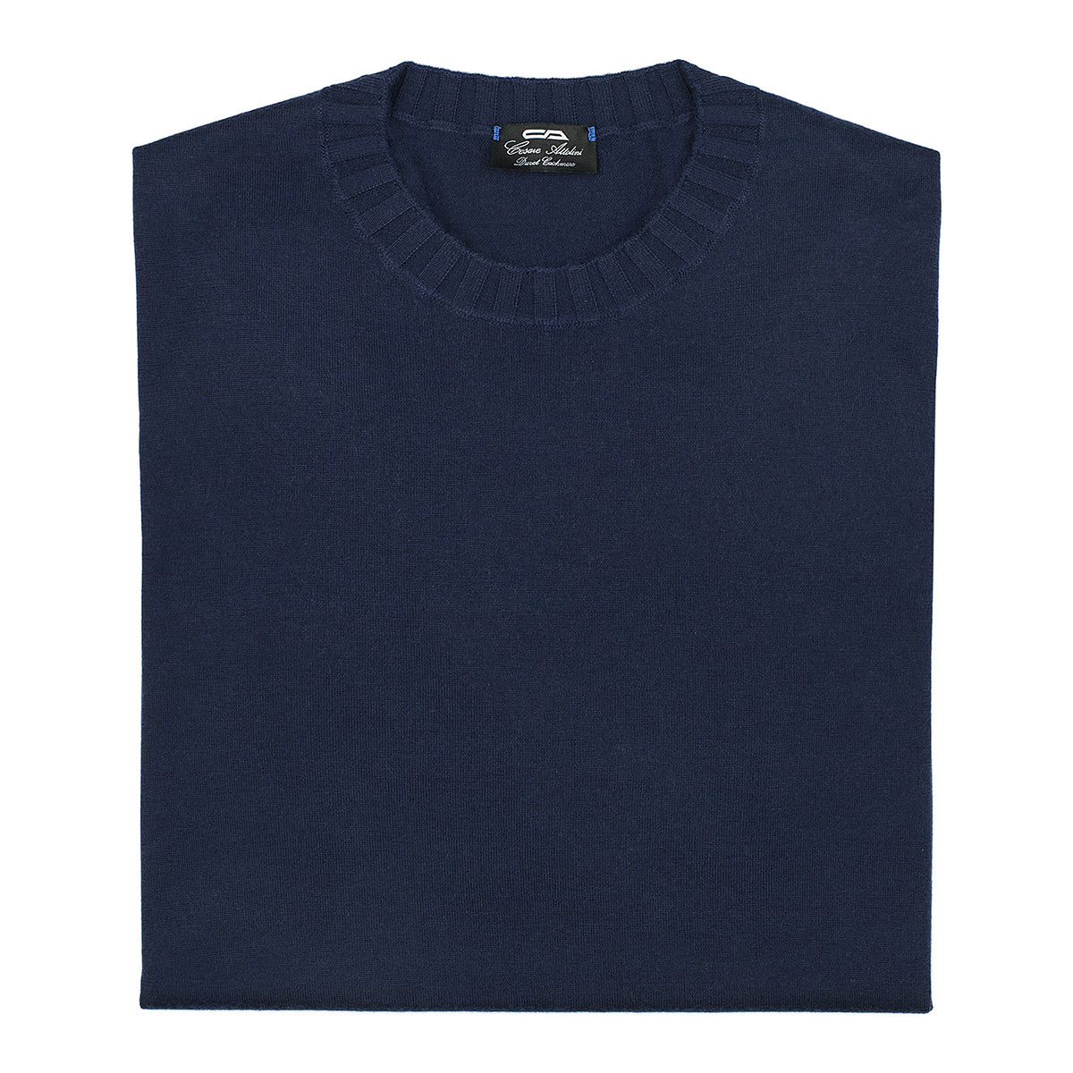 Piumino blu in cashmere con collo, polsini e balza a costine. Questo capo è realizzato nel nostro laboratorio artigianale sulle rive del Lago Trasimeno. Il prezioso filato di puro cashmere pettinato e l'esclusiva lavorazione Duvet rendono il nostro capo unico, morbido e confortevole, è ideale per un look da tempo libero, garantendo comfort e praticità.