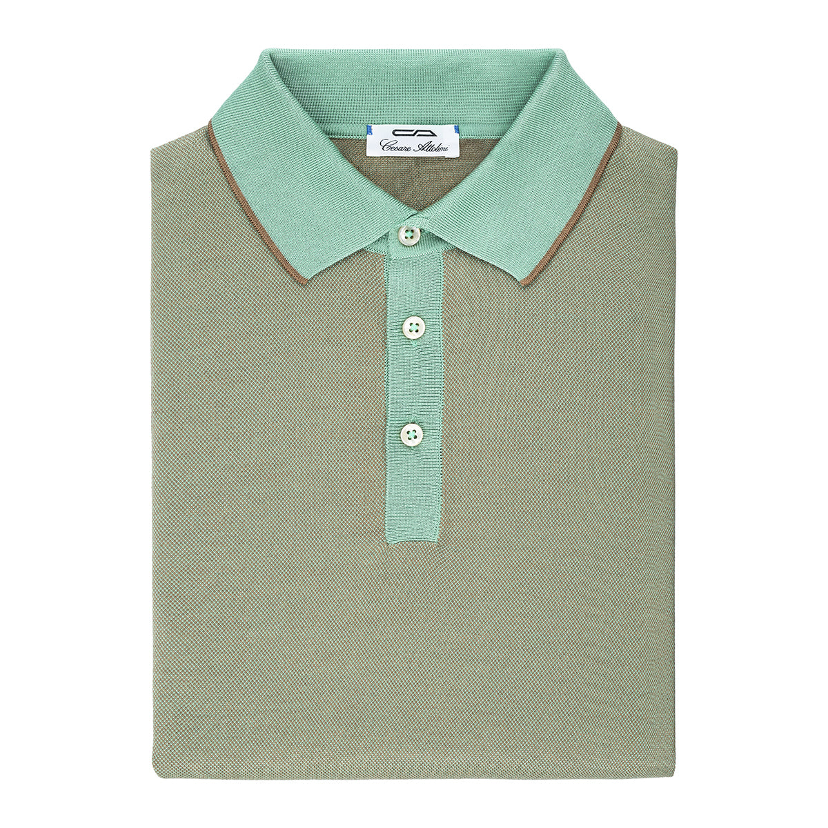 Polo con bottoni, realizzata in seta Jacquard, caratterizzata da un raffinato verde arricchito dal colletto, dall'abbottonatura e dai bordi delle maniche in una tonalità a contrasto più delicata. Un sottile bordo marrone lungo il colletto aggiunge un tocco di raffinatezza. La trama Oxford esalta la trama del tessuto, garantendo comfort e stile per ogni occasione. Questo capo è realizzato nel nostro laboratorio artigianale sulle rive del Lago Trasimeno.