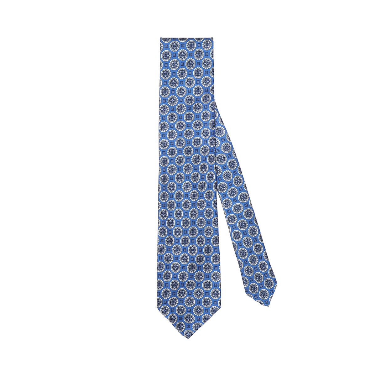 Cesare Attoliniネクタイは、生地のカットから製造まで、すべて手作りの製品です。グレーと白の円形の幾何学模様をあしらった裏地のないブルーのシルクネクタイは、オリジナルで上品なタッチを損なうことなく、スタイリッシュにコーディネートを完成させるのに最適です。